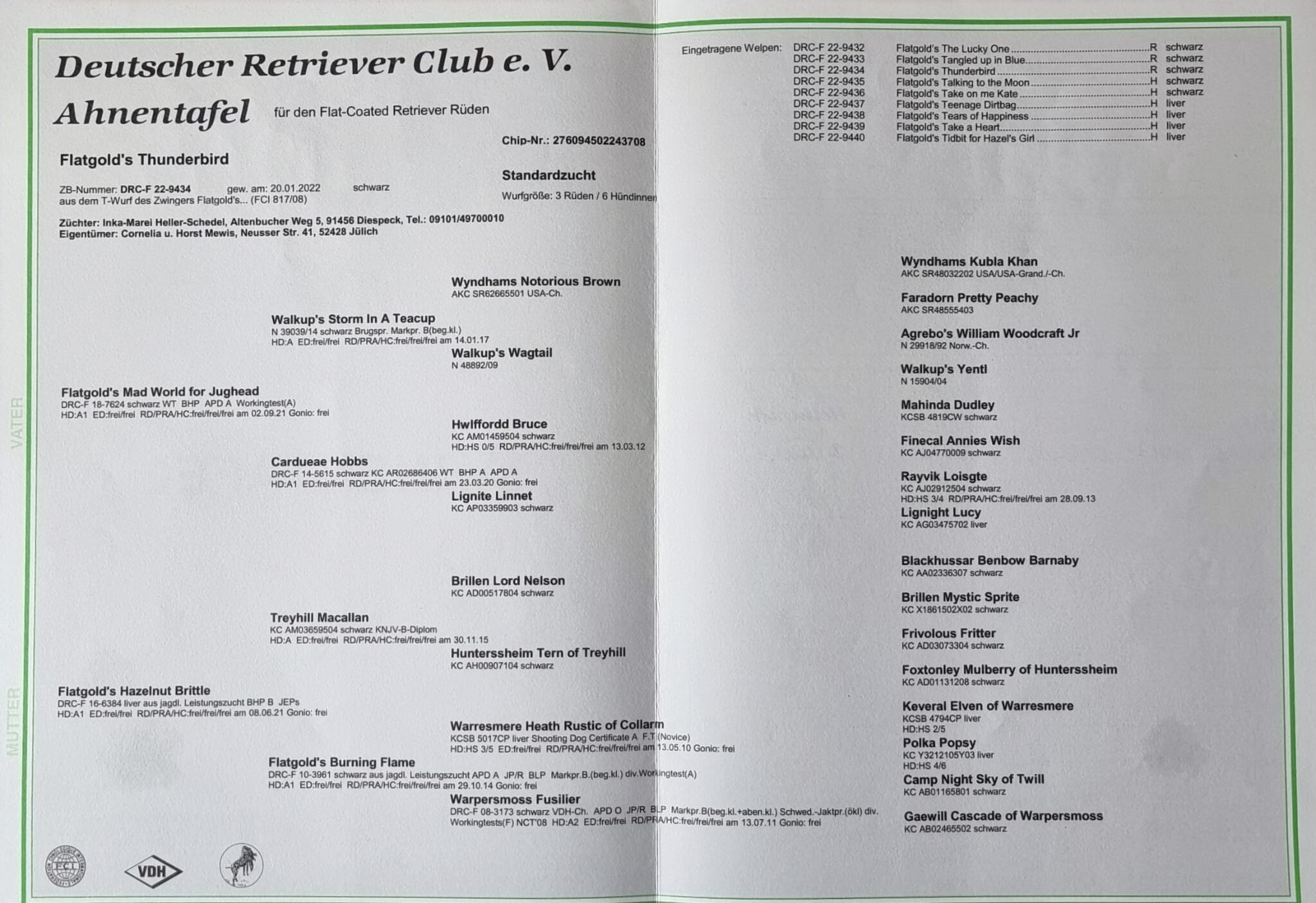 Flatgold's Thunderbird - Sunny - Ahnentafel- Stand Juni 2024